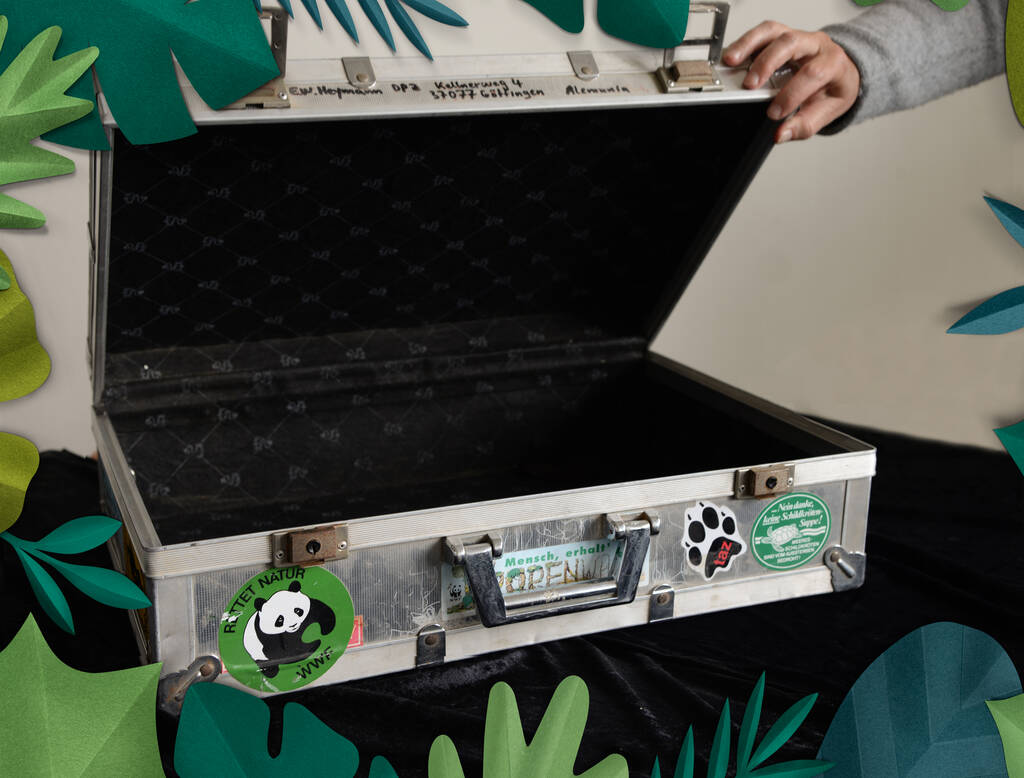It contains all the utensils needed to observe the monkeys: decent binoculars, a laptop, notepads, pencils and sample containers.